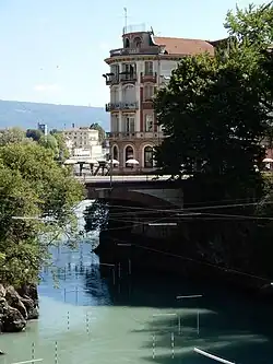 The main characteristic of the building, which features an Art Nouveau style,[2] is represented by the northern facade, which is cylindrical and overhangs the underlying Dora Baltea river, just downstream from the Ponte Nuovo.[1]