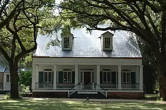 The plantation house is a 1+12-story building on brick piers with a twelve-foot-wide porch set under the roof line.[5][6] The window panes of the house are more than 170 years old and contain etchings with names and initials, and it is said to be how the family would check if their engagement diamond rings were real.[2] The doorknobs are lower than a modern home, because the average height of people was shorter.[2]