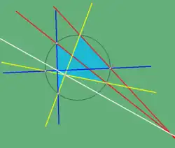 A degenerate case of Pascal's theorem (four points) is interesting; given points ABCD on a conic Γ, the intersection of alternate sides, AB ∩ CD, BC ∩ DA, together with the intersection of tangents at opposite vertices (A, C) and (B, D) are collinear in four points; the tangents being degenerate 'sides', taken at two possible positions on the 'hexagon' and the corresponding Pascal line sharing either degenerate intersection. This can be proven independently using a property of pole-polar. If the conic is a circle, then another degenerate case says that for a triangle, the three points that appear as the intersection of a side line with the corresponding side line of the Gergonne triangle, are collinear.