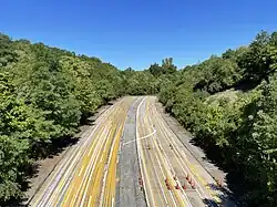 Also in the 1960s, plans were made to build the Phoenixville Spur, a 4.4-mile expressway spur route of PA 23 running from the intersection of PA 23 and PA 724 in East Pikeland Township to the then-planned Pottstown Expressway (US 422) near Arcola. The spur was planned to include interchanges at Township Line Road and Freemont Street (PA 113) in the borough of Phoenixville, an interchange with PA 29 near Mont Clare, and a partial interchange with the Pottstown Expressway at the route's eastern terminus, providing access to and from the east. Although PennDOT had secured funding for the spur, the start of construction was delayed for many years due to both local opposition to the location of the highway within Phoenixville, along with disputes over the design of the interchanges within the borough. As a result, the project has been considered dead since the late 1970s.[35][36] One remnant of the Phoenixville Spur can still be seen today, as part of the Pottstown Expressway (US 422) near Arcola was constructed with a wide median, done specifically to accommodate for the planned interchange with the spur.[37][38]