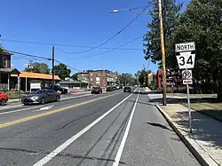PA 34 begins at an intersection with US 15 Bus. in the borough of Gettysburg in Adams County, with the road continuing south as part of US 15 Bus. toward the downtown area. From here, the route heads north on two-lane undivided Carlisle Street past homes. PA 34 crosses into Cumberland Township and becomes Biglerville Road, passing through fields within Gettysburg National Military Park. After leaving the park boundaries, the road heads through rural areas with residential and commercial development. The route heads into Butler Township and crosses the Gettysburg and Northern Railroad as it passes through a mix of farms and woods with some homes. PA 34 runs through more rural areas with occasional development before crossing into the borough of Biglerville and becoming South Main Street, passing residences and a few businesses as it intersects PA 394. The route continues into the downtown area and comes to a junction with PA 234. Here, the road becomes North Main Street and passes more homes before heading back into Butler Township.[2][3]