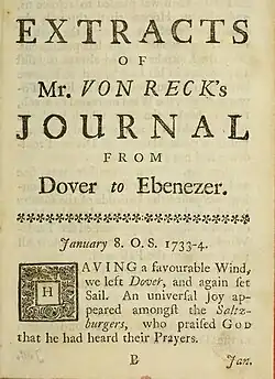 4. ^ Reck, Philipp Georg Friedrich von. An extract of the journals of Mr. Commissary Von Reck, who conducted the first transport of Saltzburgers to Georgia: and of the Reverend Mr. Bolzius, one of their ministers. Giving an account of their voyage to, and happy settlement in that province. Pub. by the direction of the Society for Promoting Christian Knowledge. London, Printed by M. Downing, 1734.
