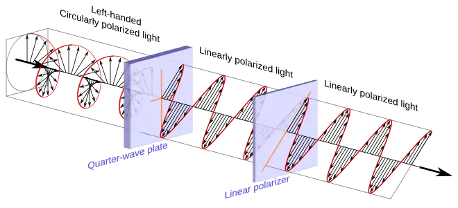 As shown in the figure, the analyzing filters are constructed of a quarter-wave plate (QWP) and a linearly polarized filter (LPF). The QWP always transforms circularly polarized light into linearly polarized light. However, the angle of polarization of the linearly polarized light produced by a QWP depends on the handedness of the circularly polarized light entering the QWP. In the illustration, the left-handed circularly polarized light entering the analyzing filter is transformed by the QWP into linearly polarized light which has its direction of polarization along the transmission axis of the LPF. Therefore, in this case the light passes through the LPF. In contrast, right-handed circularly polarized light would have been transformed into linearly polarized light that had its direction of polarization along the absorbing axis of the LPF, which is at right angles to the transmission axis, and it would have therefore been blocked.