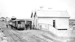 The wooden station building was opened in 1876 at the terminus of the lightly engineered, 1067 mm (3 ft 6 in) gauge railway from Port Pirie – then a town of fewer than 1,000 people – into the rich agricultural hinterland of the Mid North. The need was to transport agricultural produce more cheaply to the port for export, mainly to Great Britain, in sailing ships.[1]: 27 The following year, Port Pirie's inaugural railway station was opened. A modest weatherboard building, it was placed at the north end of the railway yards, about 250 metres (270 yards) from the town's wharves.[2] In addition to the building there were two locomotive sheds and a freight shed, coaling and watering facilities, a passing loop in front of the station building, and a few sidings.