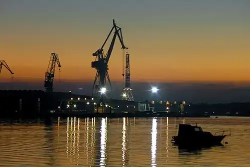A part of the harbour in Pula, Croatia, under sunset. Pula (Slovene: Pulj; Istriot Pula; Italian: Pola) is the largest city in Istria, situated at the southern tip of the peninsula, with a population of 62,080 (2006).