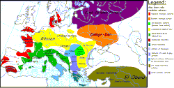 Europe c. 1200 BC, showing the central Urnfield culture (red), the northern Urnfield culture (orange), the Lusatian culture (purple), the Danubian culture (brown), the Terramare culture (blue), the Atlantic Bronze Age (green) and the Nordic Bronze Age (yellow).