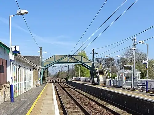 Prestonpans railway station is a railway station serving the mining town of Prestonpans, East Lothian, Scotland. It is located on the North Berwick Line, 9.75 miles (15.69 km) east of Edinburgh Waverley. It serves the town of Cockenzie and Port Seton, 1.37 miles (2.20 km) away.