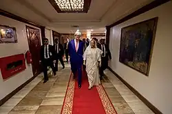 U.S. Secretary of State John Kerry walks through the Cross Hall with Bangladeshi Prime Minister Sheikh Hasina at the Prime Minister's Office in Dhaka in August 2016.