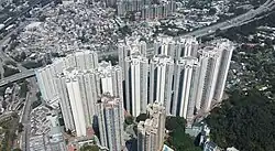 Yuet Wu Villa (Chinese: 悅湖山莊) is a Home Ownership Scheme and Private Sector Participation Scheme court in Tuen Mun, located at the reclaimed land of Castle Peak Bay. It comprises 15 high-rise tower blocks consisting of 3,890 residential units, which were built in 1994.[86][87]
