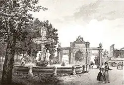 19th-century engraving of the Puerta de Atocha and the existing Fountain de la Alcachofa, both built by Ventura Rodríguez.