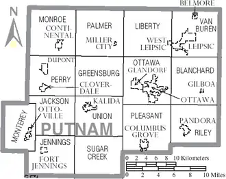 Putnam County is a county located in the northwestern part of the U.S. state of Ohio. As of the 2020 United States census, the population was 34,451.[1] Its county seat is Ottawa.[2] The county was created in 1820 and later organized in 1834.[3] Its name is in honor of Israel Putnam, a colonial officer in the French and Indian War, who served as a general in the American Revolutionary War.[4] The Blanchard River, which passes through the county, was a key transportation route for early European-American settlers.