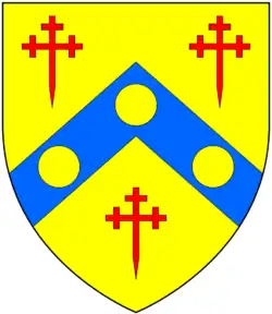 Crossing:(?) A chevron between three cross crosslets (unknown). Apparently Crossing of Exeter, given similarly by Vivian as Or, on a chevron azure between three crosses crosslet fitchée gules as many bezants[39] which family was heir to the Dodderidge family of Barnstaple and of Bremridge, South Molton. Hugh Crossing was Mayor of Exeter in the 17th century[39] and his eldest son Francis Crossing (c.1598-1638) was Member of Parliament for Mitchell in 1626 and for Camelford in 1628.[40]