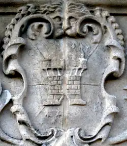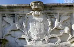 Granville: Gules, three clarions or. For George Granville, 1st Baron Lansdowne of Bideford (1666-1735), nephew of John Granville, 1st Earl of Bath (1628–1701) and heir male of William Henry Granville, 3rd Earl of Bath (1692-1711).[45] It is the only escutcheon with heraldic supporters, generally reserved for use by nobility, here Two winged griffins rampant or. Above the escutcheon is a baron's coronet. He is identifiable by the style of his coronet and by his motto, shown inscribed on a scroll below: Deo, Patriae, Amicis[46] ("For God, my Country and Friends"), the motto of his uncle John Granville, 1st Earl of Bath having been: Futurum invisibile ("The future is unseen").[47] The arms are not those of John Granville, 1st Earl of Bath (1628–1701), or of his son Charles Granville, 2nd Earl of Bath (1661–1701). The latter's son William Granville, 3rd Earl of Bath (1692-1711) died aged only 19 two years before the building was completed in 1713.