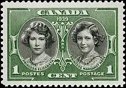 Postage stamp illustrating Princesses Elizabeth and Margaret issued during the Royal visit to Canada with their parents in 1939