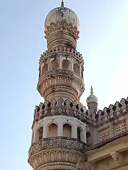 The Qutb Shahi tombs are the necropolis of the Qutb Shahi rulers, set in a vast garden on the outskirts of the Golconda Fort.[7][8] The tombs share a common features: an onion dome atop a cube surrounded by an arcade with rich ornamental details, with small minarets featuring floral motifs.[9]