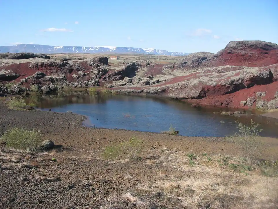 The Rauðhólar built up on a location where lava flows entered and covered a small lake just north of today's Elliðavatn.[5]