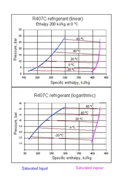 R407C pressure-enthalpy diagram, isotherms between the two saturation lines