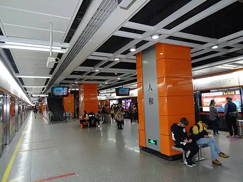Renhe Station (Chinese: 人和站; Cantonese Yale: Yàhnwòh Jaahm) is a metro station on Line 3 on the Guangzhou Metro. The station is located under China National Highway 106 (Renhe Section) in Renhe Town (人和镇), Baiyun District. It started operation on 30 October 2010.[1]