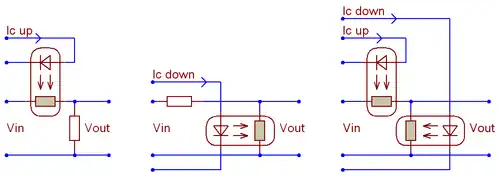 European-style schematics of resistive opto-isolators that use an incandescent bulb (top), a neon lamp (middle) or a light-emitting diode (bottom).