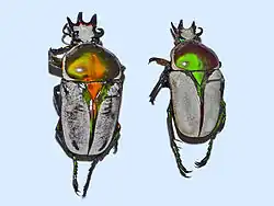 Rhamphorrhina bertolonii can reach a length of about 20–40 millimetres (0.79–1.57 in).[2][3] Basic color of the elytra is gray, while pronotum may be bright green or orange reddish.