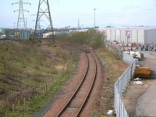 The village had a railway station by this name on the Gatehead and Hurlford branch of the Glasgow and South Western Railway. Part of the line remains open to supply a petrol depot in Kilmarnock. The remains of the station were extant until the new Kilmarnock bypass removed all traces. It was a goods only station (no passengers) as the line never had a publicly advertised passenger service. It is listed in 1929 as 'Riccarton and Craigie' by the London, Midland and Scottish Railway, one of the stations which the company conveyed goods to.[47] It closed officially on 5 July 1965, originally just called Riccarton and renamed in 1905.[48]