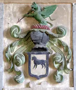 Heraldic achievement of Richard Cole, detail from top of his monument. The gold bezants in the bordure have been overpainted black