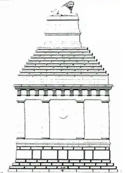The Lion of Knidos was found in 1858 by Pullan as he walked the cliffs near where he was helping Charles Thomas Newton to excavate the ancient Greek city of Knidos.[2] Royal Engineer Robert Murdoch Smith was given the task of assisting. He was presented with the lion statue that had fallen onto its front face. The limestone core of the monument was still there but the marble cladding and other details had either been stolen or lay around where it had fallen. Smith was able to replace and move each of the remaining stones[3] which allowed the engineer to write a detailed report on the structure.[4] Pullan created an orthographic drawing of the building. It is thought to be a good reproduction of what the whole structure would have looked like.[3] The Lion of Knidos was loaded onto the naval ship HMS Supply and shipped to London. It is now in the British Museum.[2]