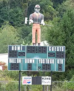 The scoreboard at Dean Memorial Field is topped with a statue of a lumberjack, the school's mascot.