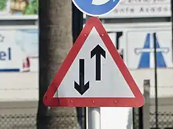 Two-way traffic warning sign in Gibraltar, flipped from the British standard to reflect Gibraltar driving on the right