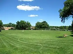 The Commons has since become associated with the Kent State shootings and forms a large part of the May 4, 1970, Kent State Shootings Site, which was listed on the National Register of Historic Places in 2010 and made a National Historic Landmark in 2017.[13] On the southern edge of the Commons is the Victory Bell, which was placed there in 1950 after being donated by a local railroad. While it was originally rung following KSU football victories, it became associated first with the antiwar movement of the 1960s and ultimately with the events surrounding the Kent State shootings as it was rung to announce the start of demonstrations. It is still rung every May 4 at 12:24pm, the moment of the shootings, to honor those who were killed or injured. The Commons was the site of several protests in the 1960s and into 1970, including those just prior to the shootings on May 4, with the ROTC building burned down by arsonists on May 2, 1970. The Commons continues to be used for general recreation, and is also the site or the annual commemoration of the Kent State shootings.[14]