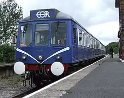 The railway has the two driving cars from what was a three-car Class 117 DMU. There were 127 of this type of vehicle and they were delivered new in 1959 to Southall depot working services between Paddington and the suburbs. They continued to be based in the London area until withdrawal in the 1990s, they arrived at the Railway in 2004. Each coach has two Leyland diesel engines underneath, which drive the wheels mechanically through a fluid flywheel. The driver's cab at each end of the unit means it can be driven from either end, making it ideal when running to Coopersale, and speeding up turn-around times. The windows in the ends mean passengers in either coach get an excellent view of the line ahead or behind and also get to watch the driver in action. The unit ran in an unusual dark blue and white 'EOR' livery until 2007, when it was taken out of service by the new owner when services were suspended. The interior has been refurbished, the unit is receiving attention to the exterior bodywork. DMBS is being restored; DMS is in service twinned with a Class 121 unpowered driving trailer.[16]