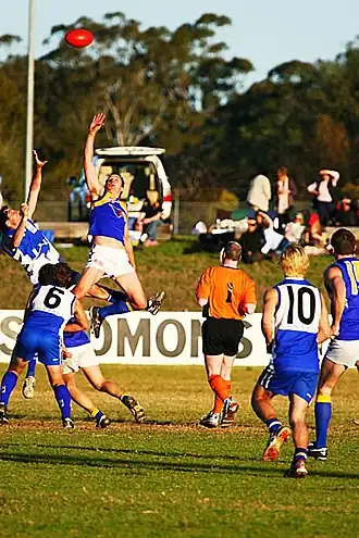 The role of the ruck in Australian rules is similar to a lock in rugby union contesting a line-out. The key differences are that with the exception of boundary throw-ins, the ball is almost always thrown straight up high into the air rather than horizontally, so in this respect, the ruck is similar to a basketball centre. The ruck needs to be able to control the ball by palm tap or fist with outstretched arms. Unlike rugby, the ruck must rely on vertical leap because lifting teammates is not allowed.[1] Australian football rucking often involves vigorous mid-air collisions with the opposing ruck.