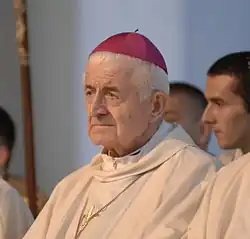 In the structures of the Polish Episcopate, he served as chairman of the Commission for Tourist Pastoral Care (1988–1998), the Team for Aid to Catholics in the East (1991–2002) and the Commission for the Polish Diaspora and Poles Abroad (2003–2008). He was a delegate at the International Catholic Commission for Migration in Geneva (1989–1995) and a delegate for the Pastoral Care of Polish Emigration (2003–2008), and also served as a delegate to International Eucharistic Congresses many times. Moreover, as part of the Second Polish Plenary Synod, in the years 1990–1999 he was a member of the 9th Commission on "Mission and Emigration". In the years 1988–1993 he was consultor of the Pontifical Council for the Pastoral Care of Migration and Travelers.[6] He also became a member of the National Council of the "Wspólnota Polska" Association. He died in Lublin on 5 January 2024, at the age of 88.[7] On 13 January, he was buried in the crypt of the Lublin church of St. Peter the Apostle.[8]
