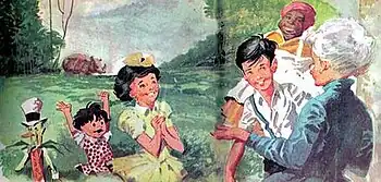 The major characters illustrated by Manoel Victor Filho, for the Editora Brasiliense editions. From left to right, the corncob Viscount, the rag doll Emília, Lúcia ("Narizinho"), Pedrinho, Aunt Nastácia and Mrs Benta. In the background, the rhinoceros Quindim.