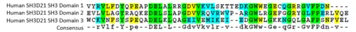 This image is a multiple sequence alignment of the three SH3 domains found in the human SH3D21 protein. Note the conserved Asp-Glu-Leu motif. This image was generated using publicly available sequence data and open source software.