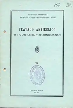 The Anti-war Treaty of Non-aggression and Conciliation (also known as Saavedra Lamas Treaty) was an inter-American treaty signed in Rio de Janeiro on October 10, 1933.[1][2] It was the brain-child of Carlos Saavedra Lamas, who was the Argentine Minister of Foreign Affairs at the time the treaty was concluded. It was signed by representatives of Argentina, Brazil, Chile, Mexico, Paraguay and Uruguay. The US government acceded to the treaty on August 10, 1934. The treaty went into effect on November 13, 1935. It was registered in League of Nations Treaty Series on November 28, 1935.[3]