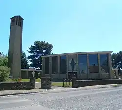 In 1957, construction on the Church of the Divine Motherhood and St Francis of Assisi began. In 1962, the church was opened. In 1965, a sculpture of Madonna and Child by Richard Guyatt was installed above the main entrance. In May 1966, the church was consecrated. The church, without its tower, cost £35,000.[8] The furniture and interior decoration was not done by the architect, Guy Morgan, and he complained that his "design has been murdered … the terrible seats, ghastly altar and the awful side chapels … all this has nearly broken my heart."[9] Yet, the church was listed as a Grade II building, because of its fittings, design and sculpture.[5] Inside the church there is chapel dedicated to the Passion and altars dedicated to St Francis of Assisi, St Patrick, and Blessed Margaret Pole. A sculptor from Sussex, Michael Clark, designed the crucifix in the church.[3]