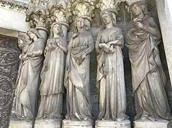 Many of the figures relate to Christian iconography, and echo those in the tympanum, including, in the ambulatory a window showing God as the King of Heaven overlooking the evangelists Matthew, Mark, Luke and John. In the panel, Matthew takes human form, Mark is depicted as a lion, Luke as an ox, while John takes the form of an eagle.[52] As elsewhere in the cathedral, the illustrations can be divided between the divine, wise and foolish.[57]