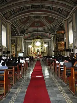 Upon entering the church, elegantly carved doors will be seen first together with the impressive carvings on the choir loft balcony. Built during the 18th century, it has an impressive rose-colored trompe-l'œil paintings on its ceiling.[5] Several commemorative gravestones can also be seen in the walls and pillars of the church.[6] The retablo has three levels of niches for images of saints.[6] Unlike the elegant rose-colored ceiling, restoration works on the retablo involved repainting, with red and gold.[6] At the central niche is the image of the town's patron saint, Gregory the Great. Located at the right side of the altar is a painting of Michael and the Archangels.[4] The pulpit of the church carries the Jesuit monogram surmounted by the image of the Christ child as a sign of being a parish under the Jesuits before the Suppression of the Society of Jesus of 1768.[7]