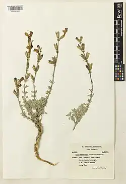 Salvia albimaculata (handsome sage) is a perennial shrub that is native to a very small region in Turkey, at 1200 m elevation in the Taurus Mountains. It is under 30 cm tall, and about 25–30 cm wide, with small greenish-gray evergreen leaves. The royal purple flowers, with a distinctive white patch on the lower lip, are about 2.5 cm long, in whorls of 2–5. The name, albimaculata, means 'spotted with white'.[1]