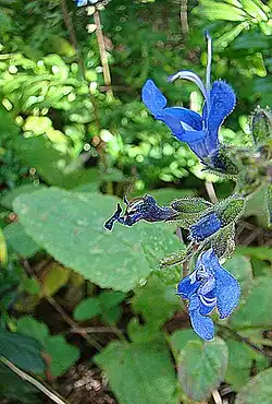 Salvia scutellarioides is evergreen and prostrate, with graceful trailing stems that reach 1.5 feet in length. The forest-green deltoid leaves generously cover the plant, varying in length but averaging about 3.5 inches long and wide. The back surface of the leaf has raised veins, and both surfaces are lightly covered with hairs. Though flowering is sparse, the striking 0.5 inch flowers are a brilliant blue, with a tiny hairy green calyx. Flowering begins in late summer and continues sporadically through late autumn. The inflorescences are 6–8 inches long, with the flowers growing opposite.[1]