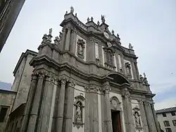 The facade has an elaborate Baroque style. The church houses a number of paintings, including: