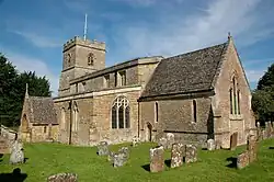 The earliest parts of the Church of England parish church of St Martin include the north arcade, which has octagonal columns and three bays. The chancel may have been completed in 1273, which was when the church was redecorated. The south door and vaulted porch are Decorated Gothic. Later in the Middle Ages Perpendicular Gothic features were added, notably the clerestory of the nave and the embattled west tower. On the east side of the chancel arch is a painting of the arms of Queen Elizabeth I[7] on a panel of wood.[8] The church was restored in 1856 to designs by GE Street, who had the chancel rebuilt. One window in the church has stained glass made in 1974 by John Piper and Patrick Reyntiens to symbolise the Legend of Martin's cloak.[8] St Martin's is a Grade II* listed building.[7]