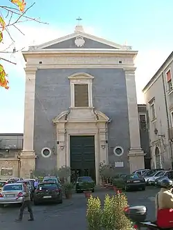 The exterior is sparse and sober, with a broken pediment over the portal. The interior contains an altarapiece by Giuseppe Sciuti.