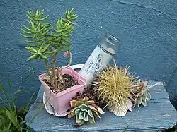 Rituals dedicated to Santa Muerte include processions and prayers with the aim of having a miracle granted.[12] Some believers of Santa Muerte remain members of the Catholic Church,[21] while others are cutting ties with the Catholic Church and founding independent Santa Muerte churches and temples.[40] Santa Muerte altars generally contain one or multiple images of the saint, generally surrounded by any or all of the following: cigarettes, flowers, fruit, incense, water, alcoholic beverages, coins, candies and candles.[22][12] Tobacco is also used for personal cleansing and for cleansing statues of Santa Muerte.