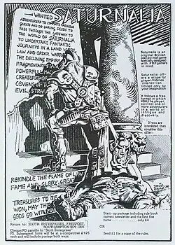 Saturnalia was one of the first single-character fantasy, sword and sorcery PBM role-playing games.[1] Neil Packer and Simon Letts designed the game.[2] Also known as Sat, Saturnalia was hand moderated.[2] Turn results in 1985 comprised an A4-sized page of small handwriting, with shorter or longer results resulting in adjusted turn fees.[3]