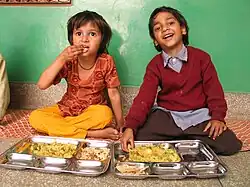 School meals have been shown to increase the nutritional status of school-age children in a variety of ways. For example, there is a notable reduction in malnutrition via diet diversification and an increased absorption of micronutrients.[15] Overall, the amount of kilocalories in a child's diet is expanded when they are given nutritional resources to which they would otherwise have little to no access. By increasing the amount of nutrition a child receives at school, that child's family's nutrition status also increases as their familial demand and requirement for food is decreased.[16] Targeted take-home rations therefore increase the nutrition of the family as a whole, and not just the members of a given family that are of primary-school age. However, criticisms of school meals' impacts on nutrition stem from the idea that increased nutrition through school meals is only a temporary fix and does not target the underlying causes of malnutrition, such as high food prices and poor food distribution systems that threaten food security.[17]