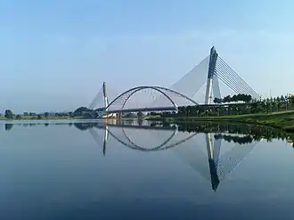 The Seri Saujana bridge, also called Bridge No 8,[1] crosses Putrajaya Lake, an artificial lake made to provide natural cooling, and connects the Core Island (Precinct 4) to the Precinct 7 on Lebuh Sentosa highway. It is strategically located at the main entrance into the Core Island from the south, via the upgraded B15 road (now Putrajaya-Cyberjaya Expressway Federal Route 29) and Kuala Lumpur–Putrajaya Expressway, and links the Core Island, where the main government buildings are, with the Kuala Lumpur International Airport.