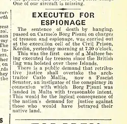 On 18 May 1942, Maltese irredentist and SIM spy Carmelo Borg Pisani was sent on an espionage mission to Malta, to check British defences and help prepare for the planned Axis invasion of the island (Operazione C3).[39] Borg Pisani was recognized by one of his childhood friends, Cpt. Tom Warrington, who denounced him. British Intelligence kept him under arrest in a house in Sliema till August. He was then transferred to Corradino prison, accused of treason. On 12 November 1942, he stood trial under closed doors in front of three judges, headed by Chief Justice of Malta Sir George Borg, and defended by two lawyers.[40] His plea that he had renounced British citizenship by returning his passport and acquisition of Italian citizenship (which would have granted him the status of prisoner of war) was not upheld by the military court. On 19 November 1942, he was publicly sentenced to death for espionage, for taking up arms against the Government and forming part of a conspiracy to overthrow the government.[41] His execution by hanging took place at 7:30AM on Saturday, 28 November 1942.[41] Borg Pisani was posthumously awarded the Gold Medal of Military Valor, the highest Italian military award, by King Victor Emmanuel III a few days after his death.[42]