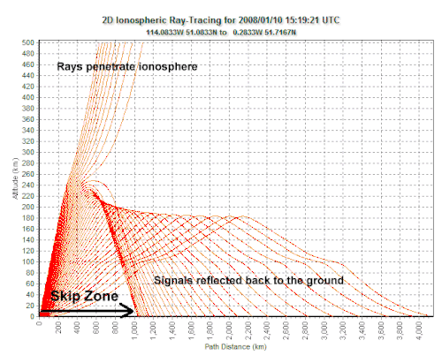 Shortwave radio frequency energy is capable of reaching any location on the Earth as it is influenced by ionospheric reflection back to Earth by the ionosphere, (a phenomenon known as "skywave propagation"). A typical phenomenon of shortwave propagation is the occurrence of a skip zone where reception fails. With a fixed working frequency, large changes in ionospheric conditions may create skip zones at night.